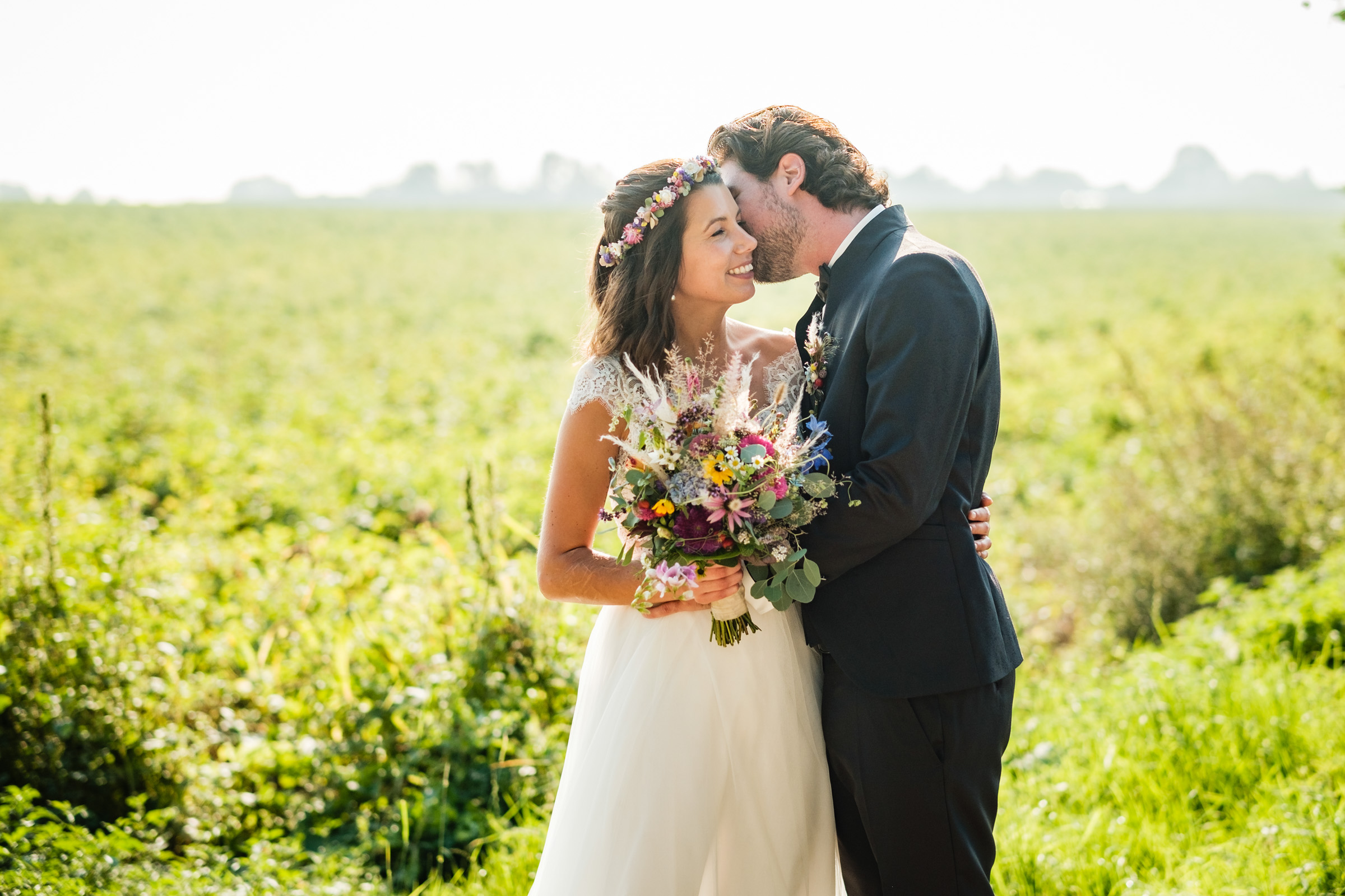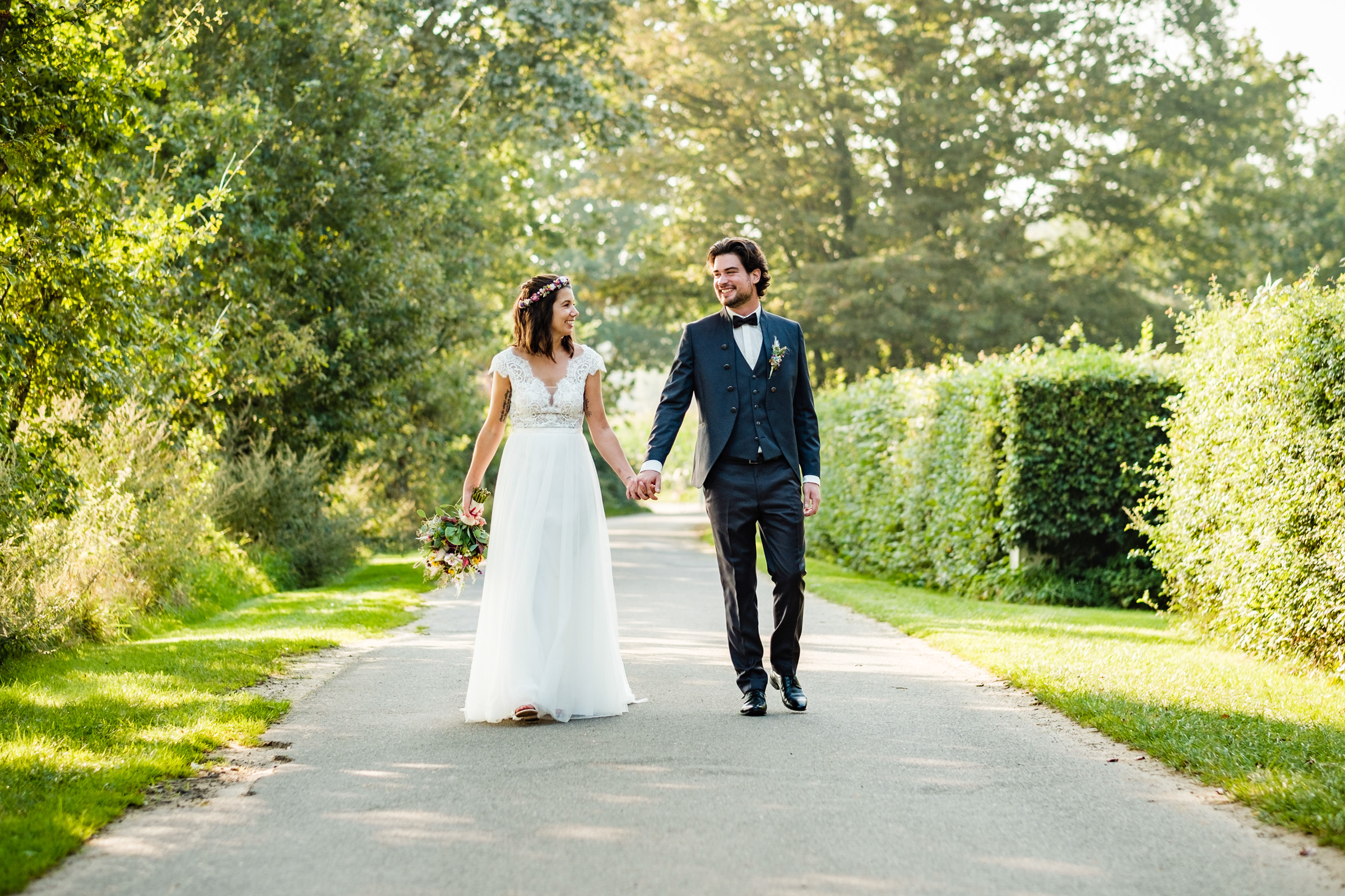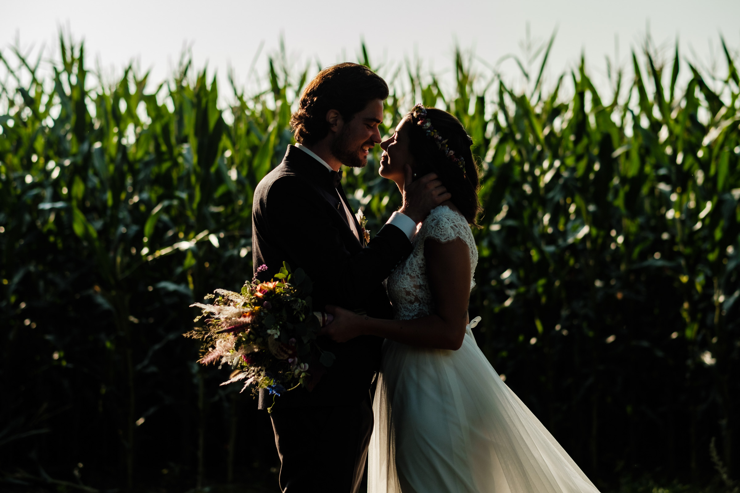 Gerade im Sommer, wenn das Licht in den Abendstunden weich wird, bietet die ländliche Umgebung rund um das Café Kornblume Möglichkeiten für ein Brautpaar-Shooting, das zeitlos und emotional zugleich ist.