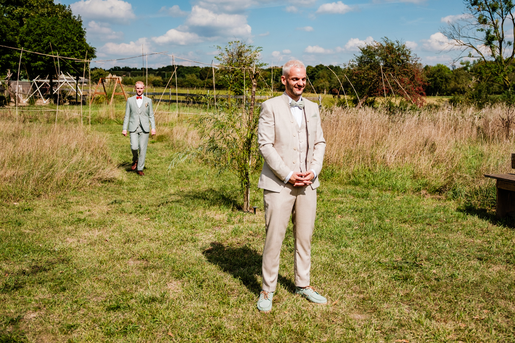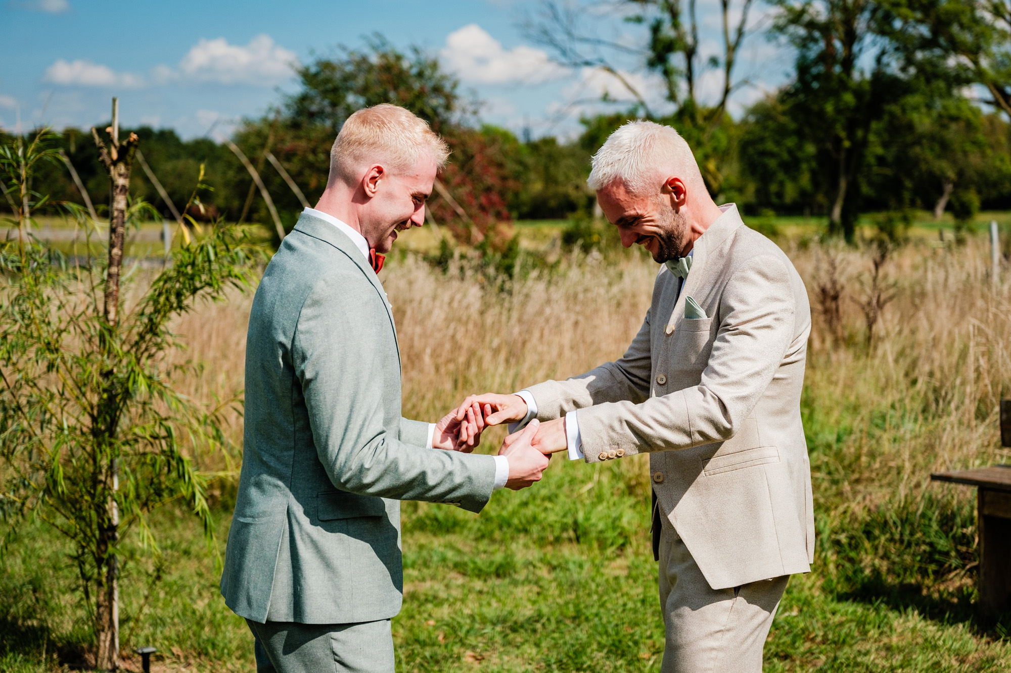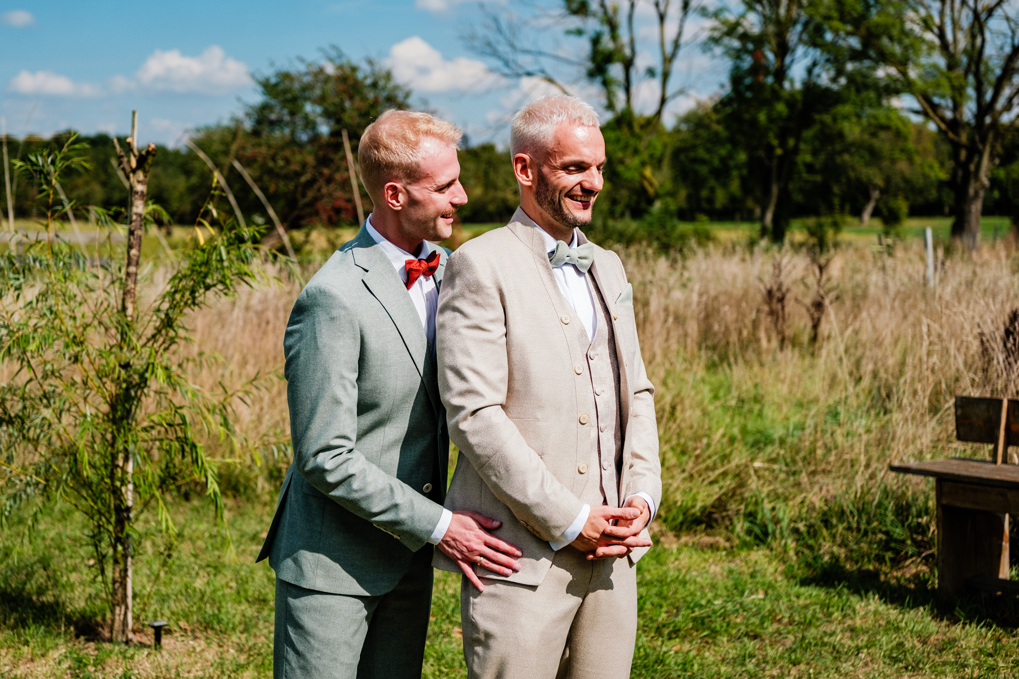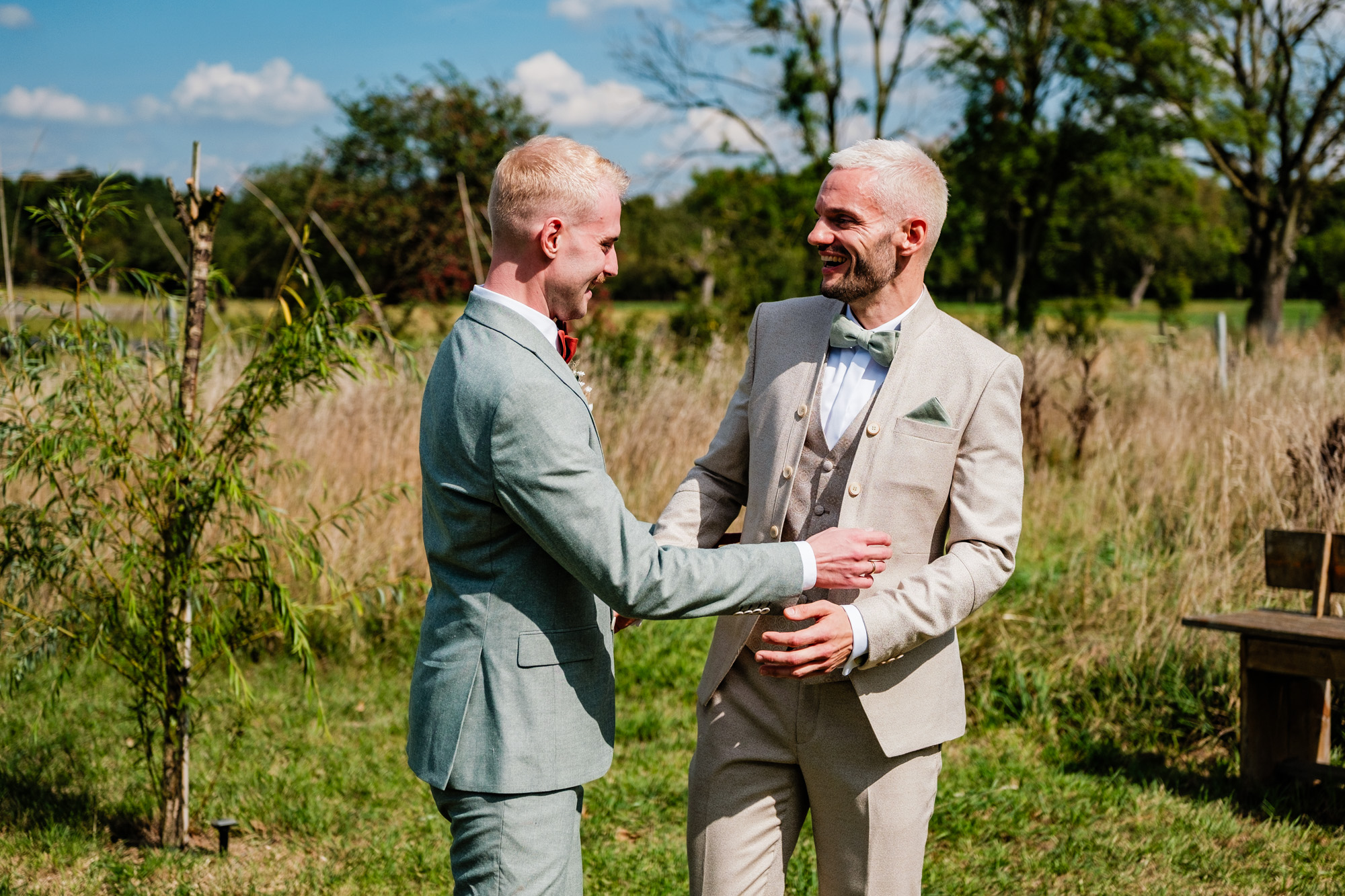 Der Tag startete mit einem emotionalen First Look im Garten des Freya Duisburg. inmitten des Grün begegneten sich Tobi und Chris zum ersten Mal in ihren tollen Hochzeitsoutfits. Dieser intime Moment vor der Zeremonie ist immer einer meiner liebsten Augenblicke als Hochzeitsfotograf – voller Aufregung, Liebe und echter Emotionen.
