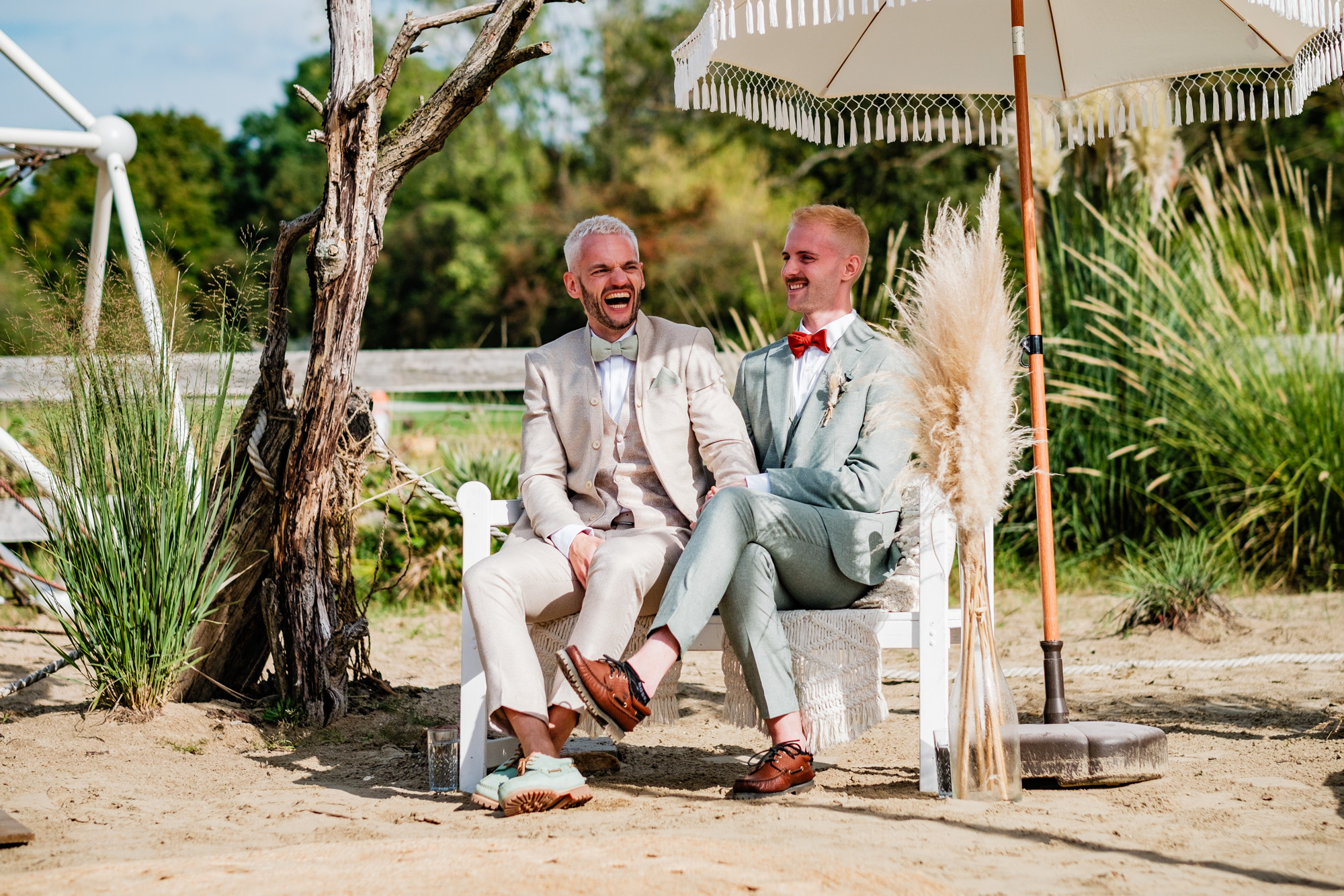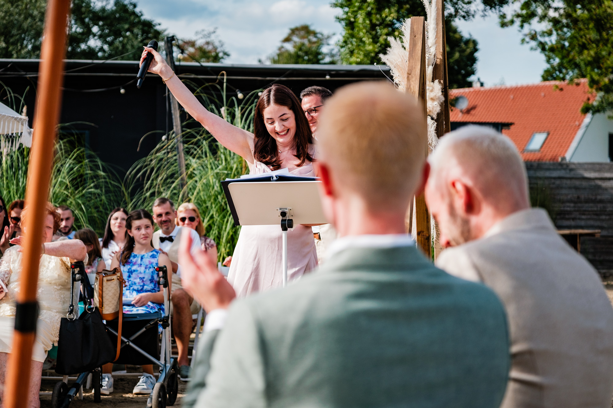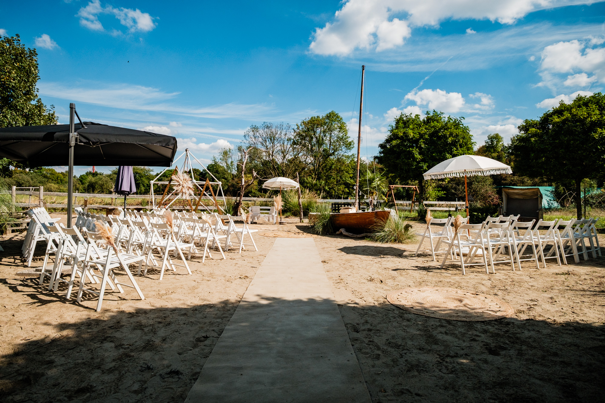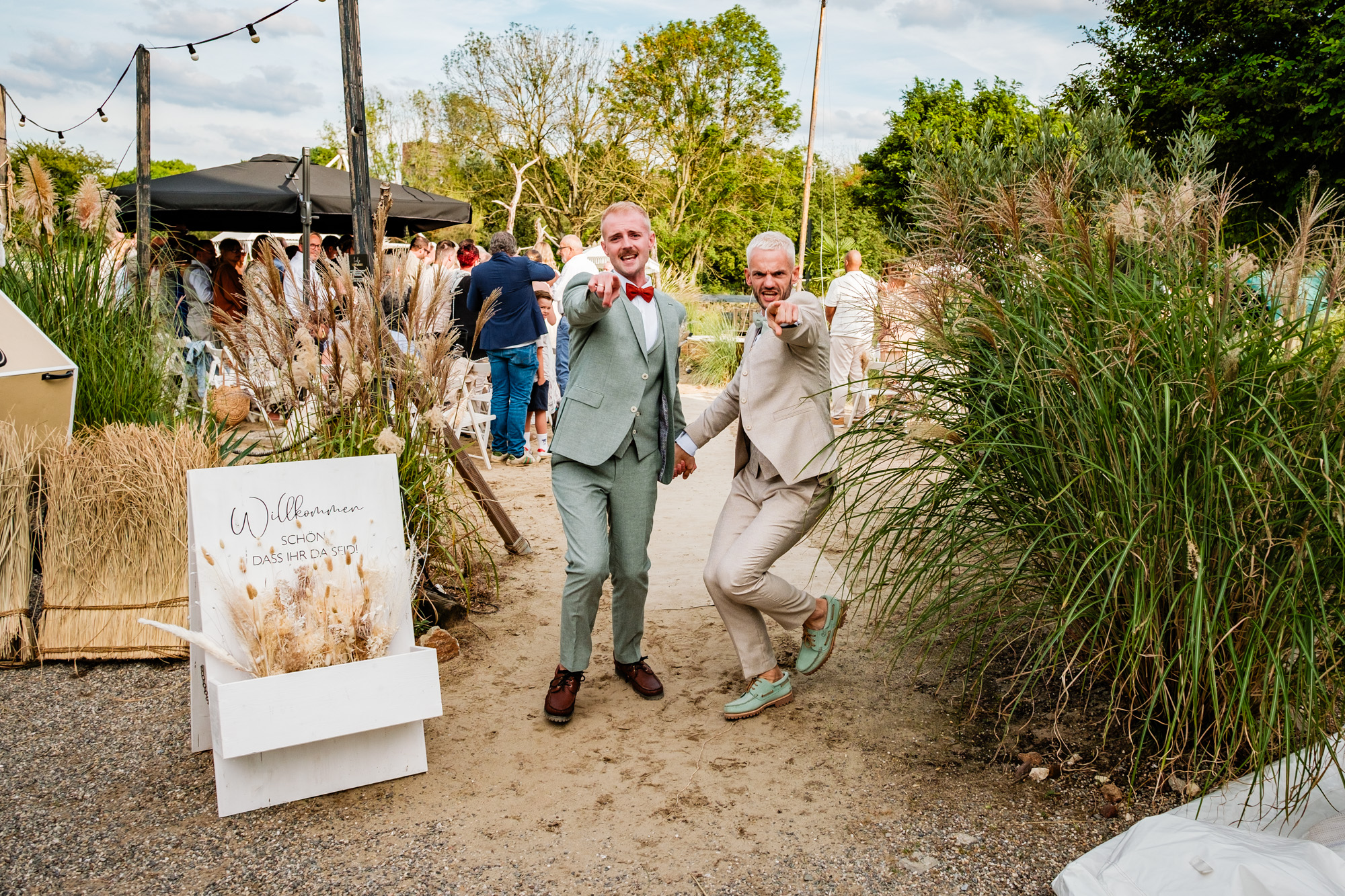 Anschließend begann die freie Trauung auf dem wunderschönen Außengelände der Location. Das Freya bietet durch seine Gestaltung eine herrliche Strandatmosphäre mitten in Duisburg, was für eine entspannte und gleichzeitig festliche Stimmung sorgte. Unter einem kleinen Sonnenschirm im Beachstyle gaben sich Tobi und Chris bei strahlendem Sonnenschein das Ja-Wort – umgeben von Familie, Freunden und jeder Menge guter Laune.
