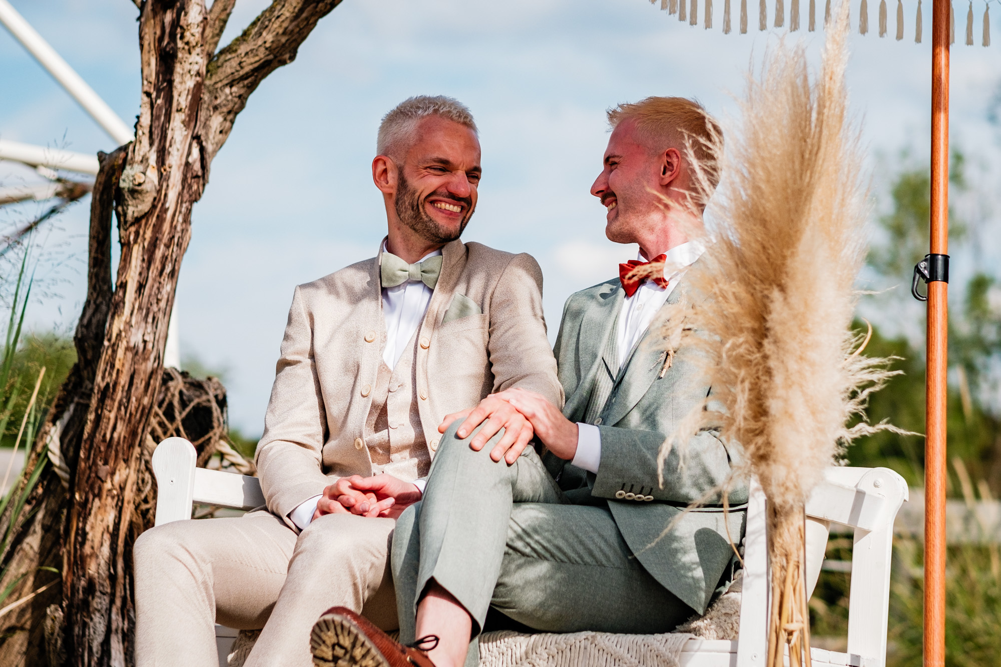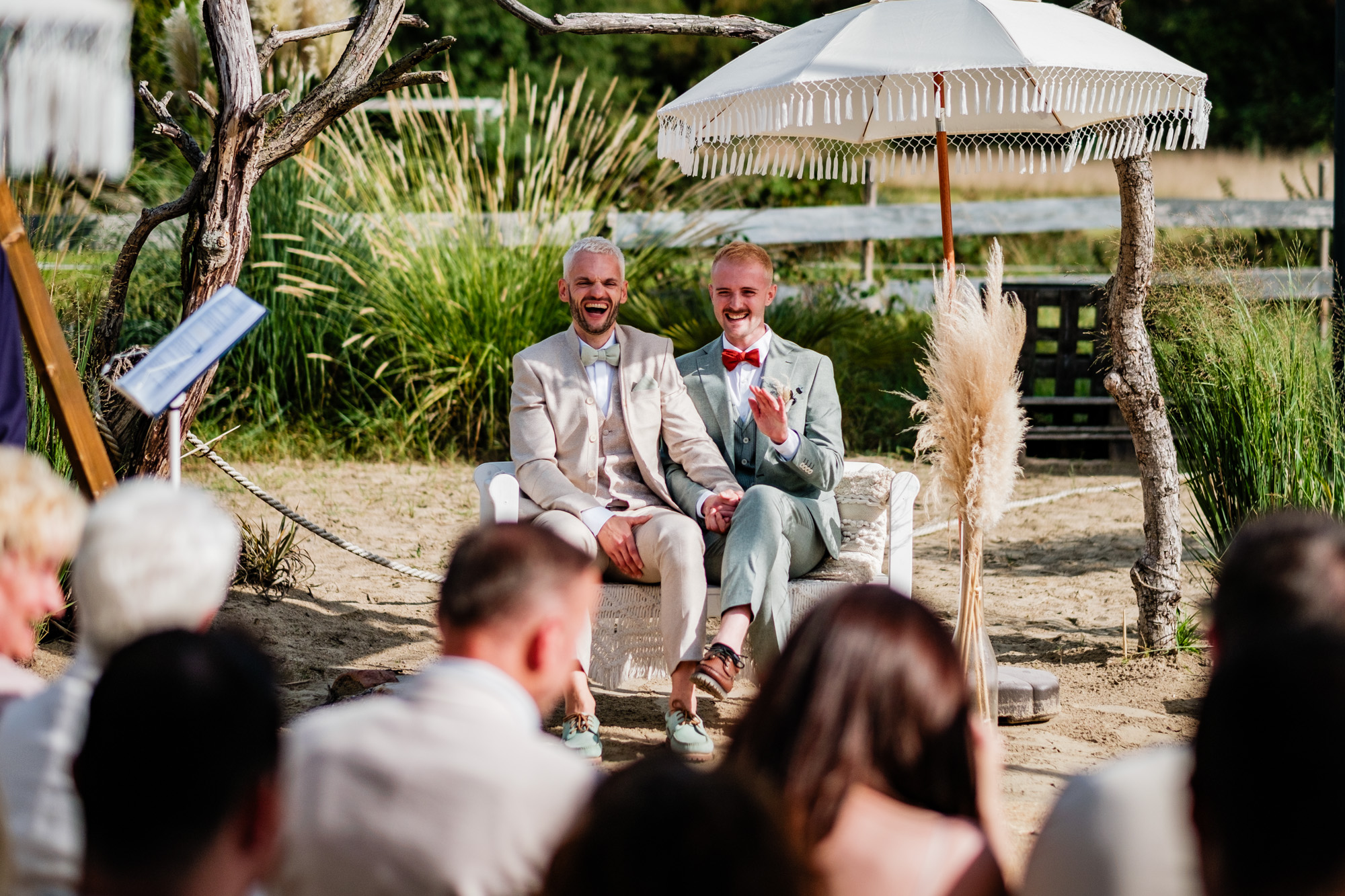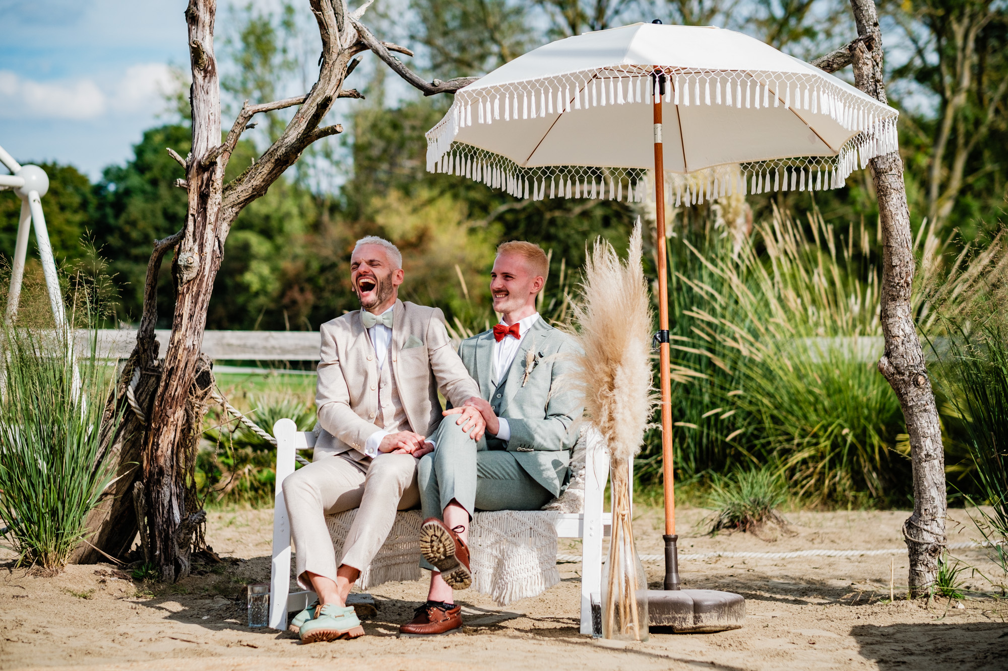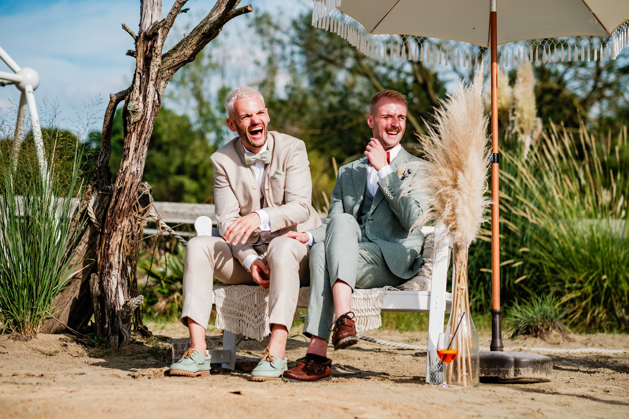 Anschließend begann die freie Trauung auf dem wunderschönen Außengelände der Location. Das Freya bietet durch seine Gestaltung eine herrliche Strandatmosphäre mitten in Duisburg, was für eine entspannte und gleichzeitig festliche Stimmung sorgte. Unter einem kleinen Sonnenschirm im Beachstyle gaben sich Tobi und Chris bei strahlendem Sonnenschein das Ja-Wort – umgeben von Familie, Freunden und jeder Menge guter Laune.