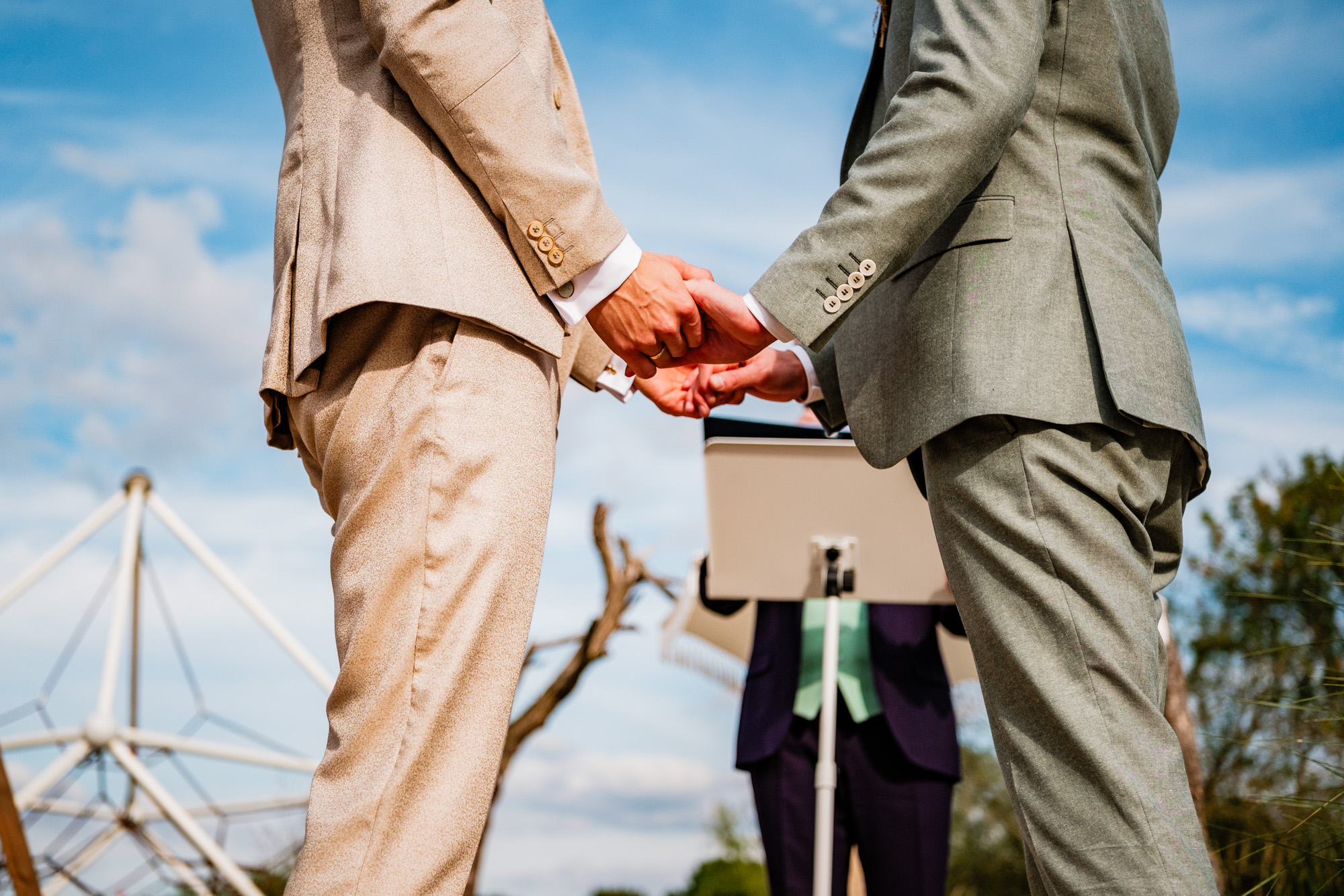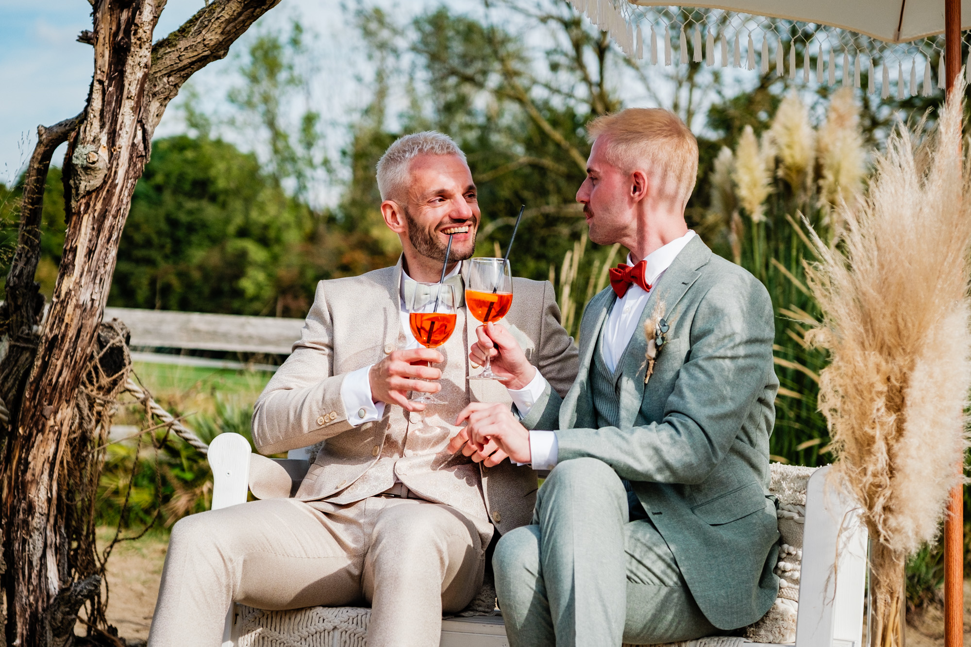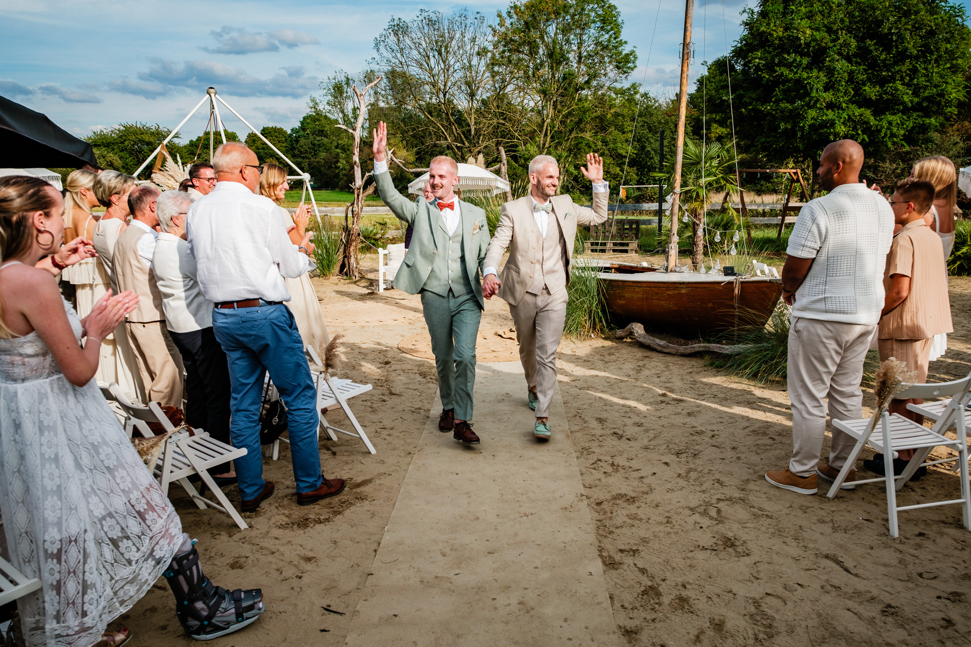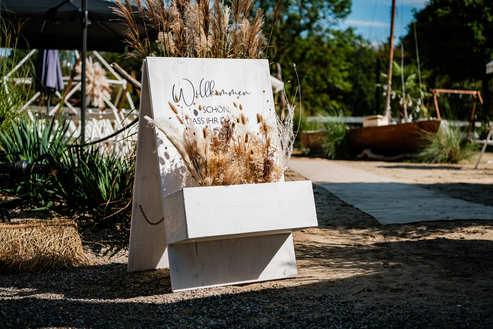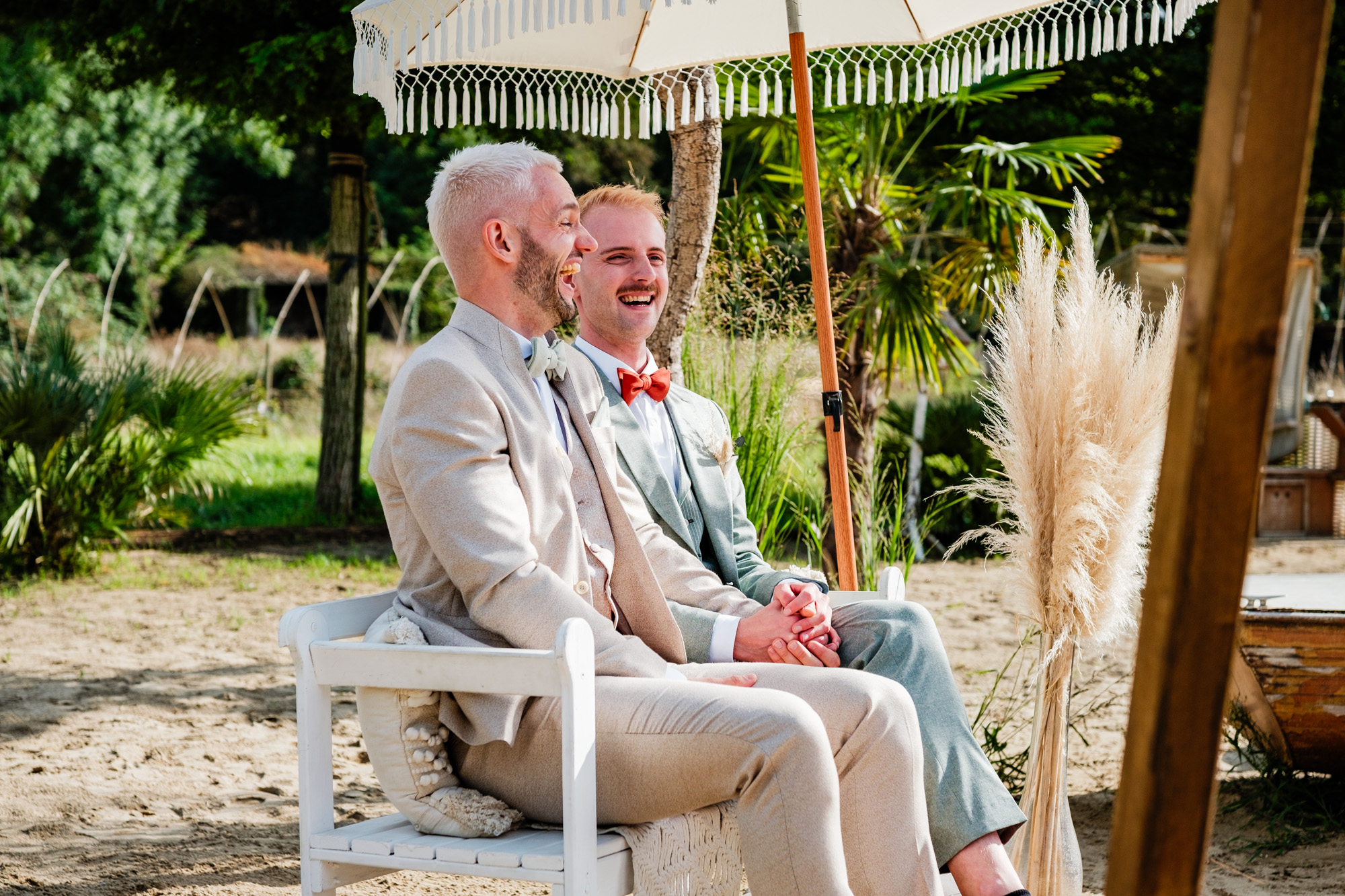 Anschließend begann die freie Trauung auf dem wunderschönen Außengelände der Location. Das Freya bietet durch seine Gestaltung eine herrliche Strandatmosphäre mitten in Duisburg, was für eine entspannte und gleichzeitig festliche Stimmung sorgte. Unter einem kleinen Sonnenschirm im Beachstyle gaben sich Tobi und Chris bei strahlendem Sonnenschein das Ja-Wort – umgeben von Familie, Freunden und jeder Menge guter Laune.