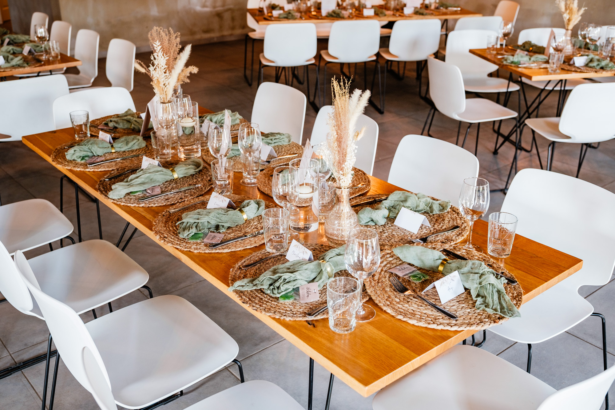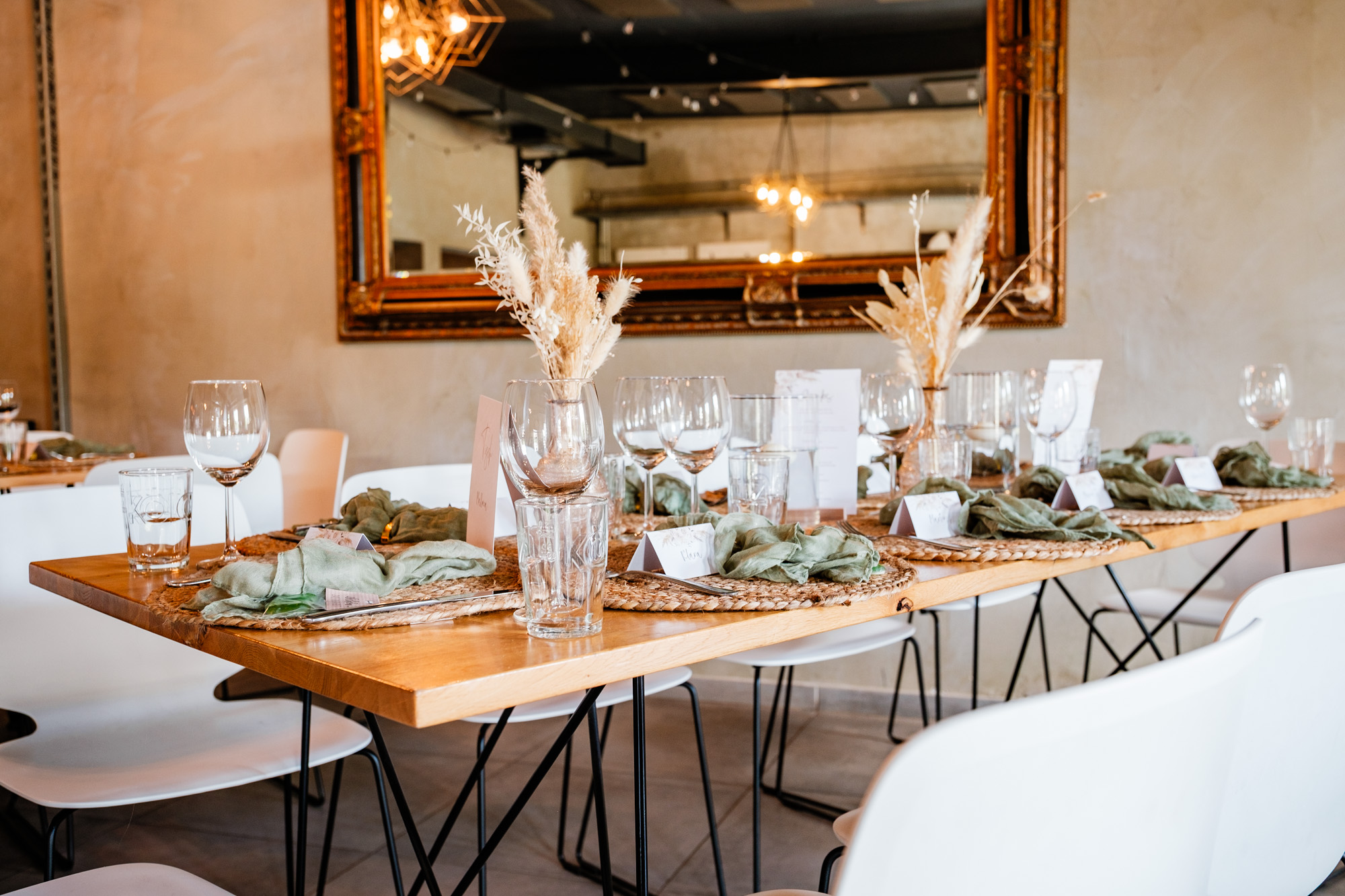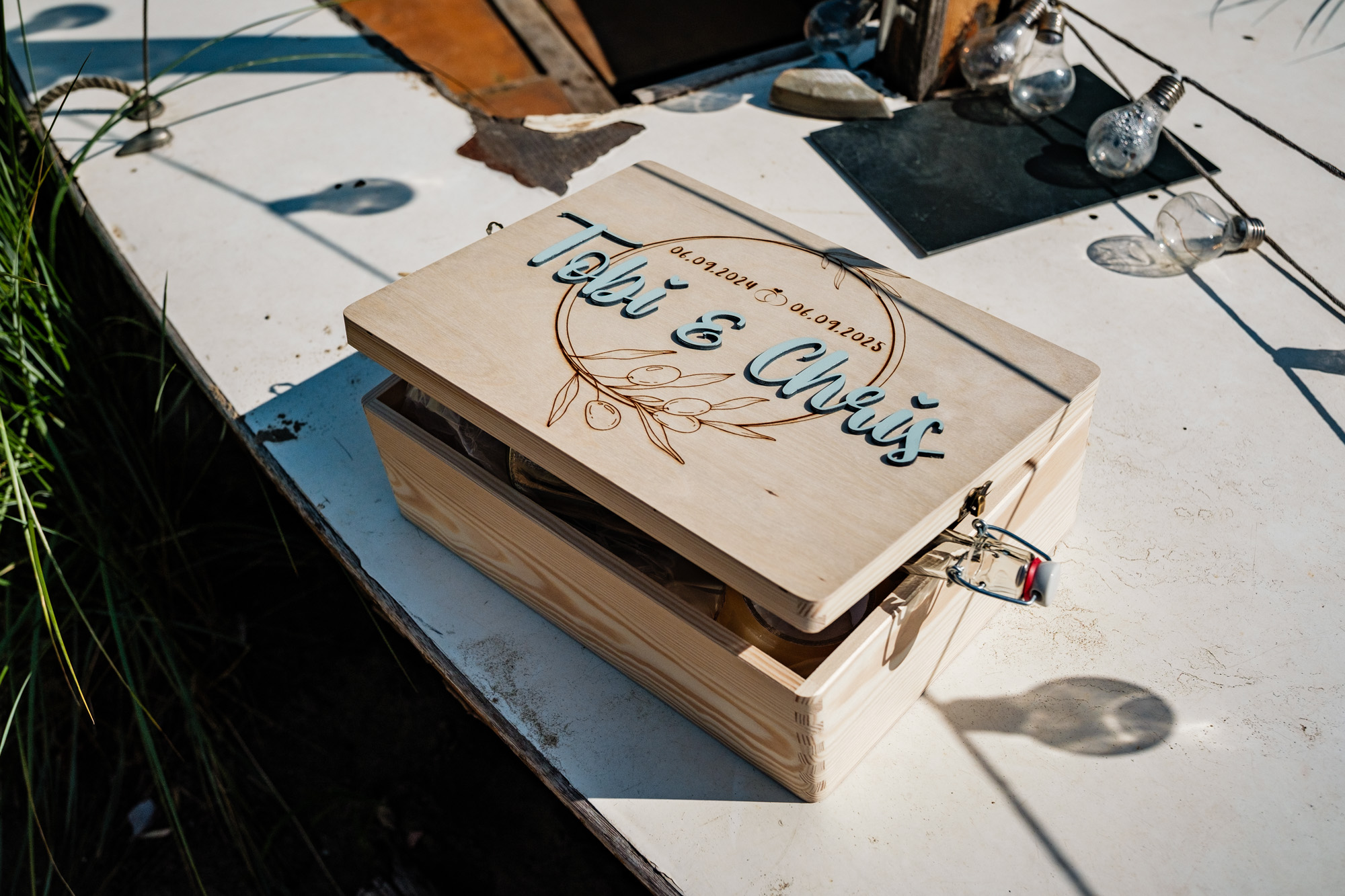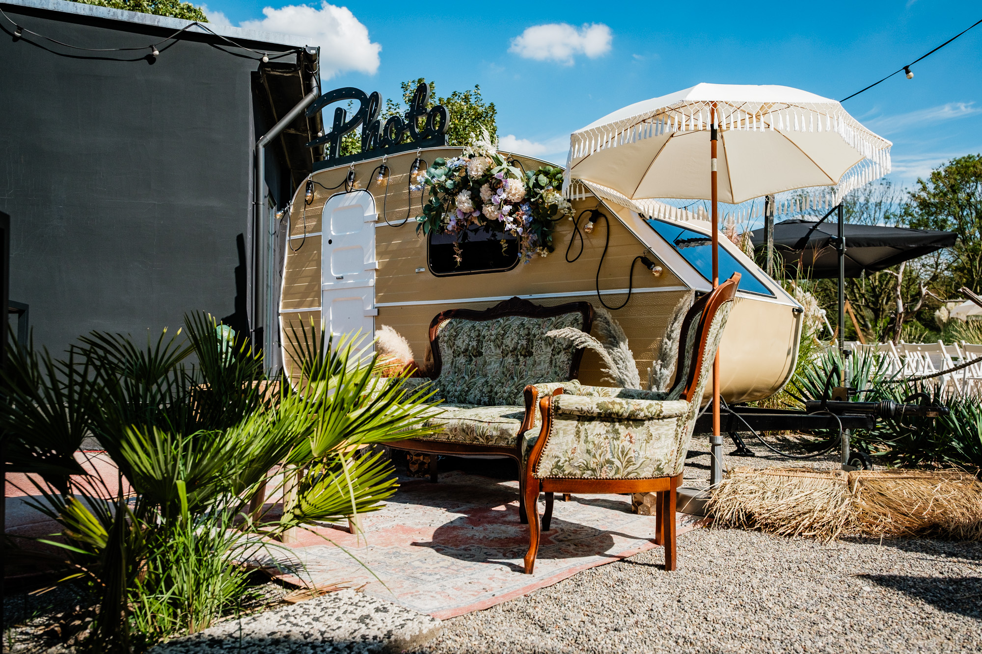 Anschließend begann die freie Trauung auf dem wunderschönen Außengelände der Location. Das Freya bietet durch seine Gestaltung eine herrliche Strandatmosphäre mitten in Duisburg, was für eine entspannte und gleichzeitig festliche Stimmung sorgte. Unter einem kleinen Sonnenschirm im Beachstyle gaben sich Tobi und Chris bei strahlendem Sonnenschein das Ja-Wort – umgeben von Familie, Freunden und jeder Menge guter Laune.