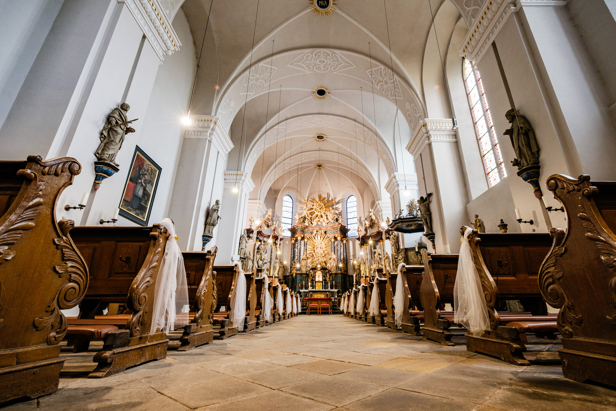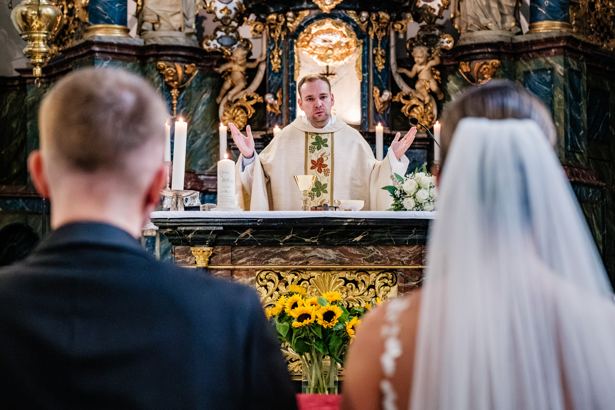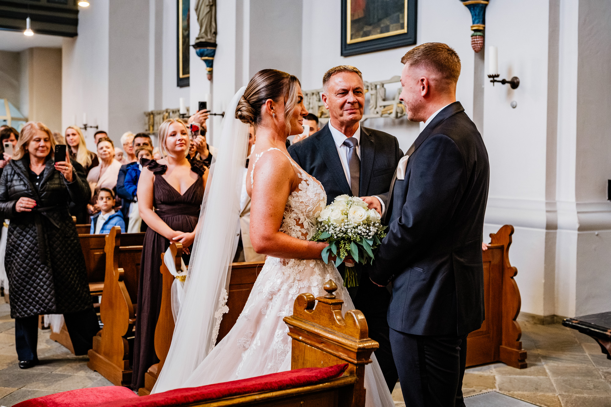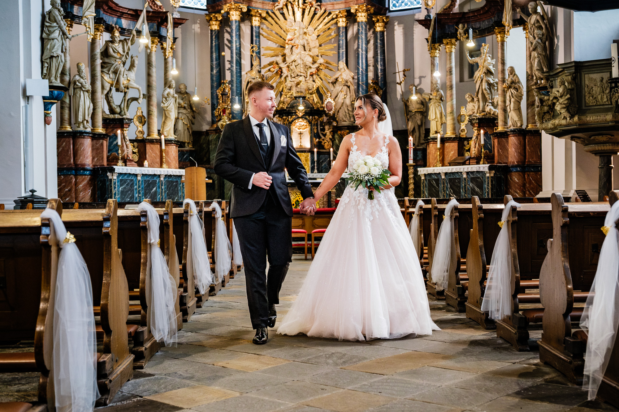 Danach ging es zur kirchlichen Trauung. Ich liebe es, diesen Moment zu fotografieren, wenn sich die Türen der Kirche öffnen und die Braut ihren großen Auftritt hat. Als Silvana mit ihrem Papa den Gang entlangschritt und Mateusz sie zum ersten Mal im Brautkleid sah, war da dieser Blick – voller Liebe, Staunen und Glück. Solche Sekunden sagen oft mehr als tausend Worte.