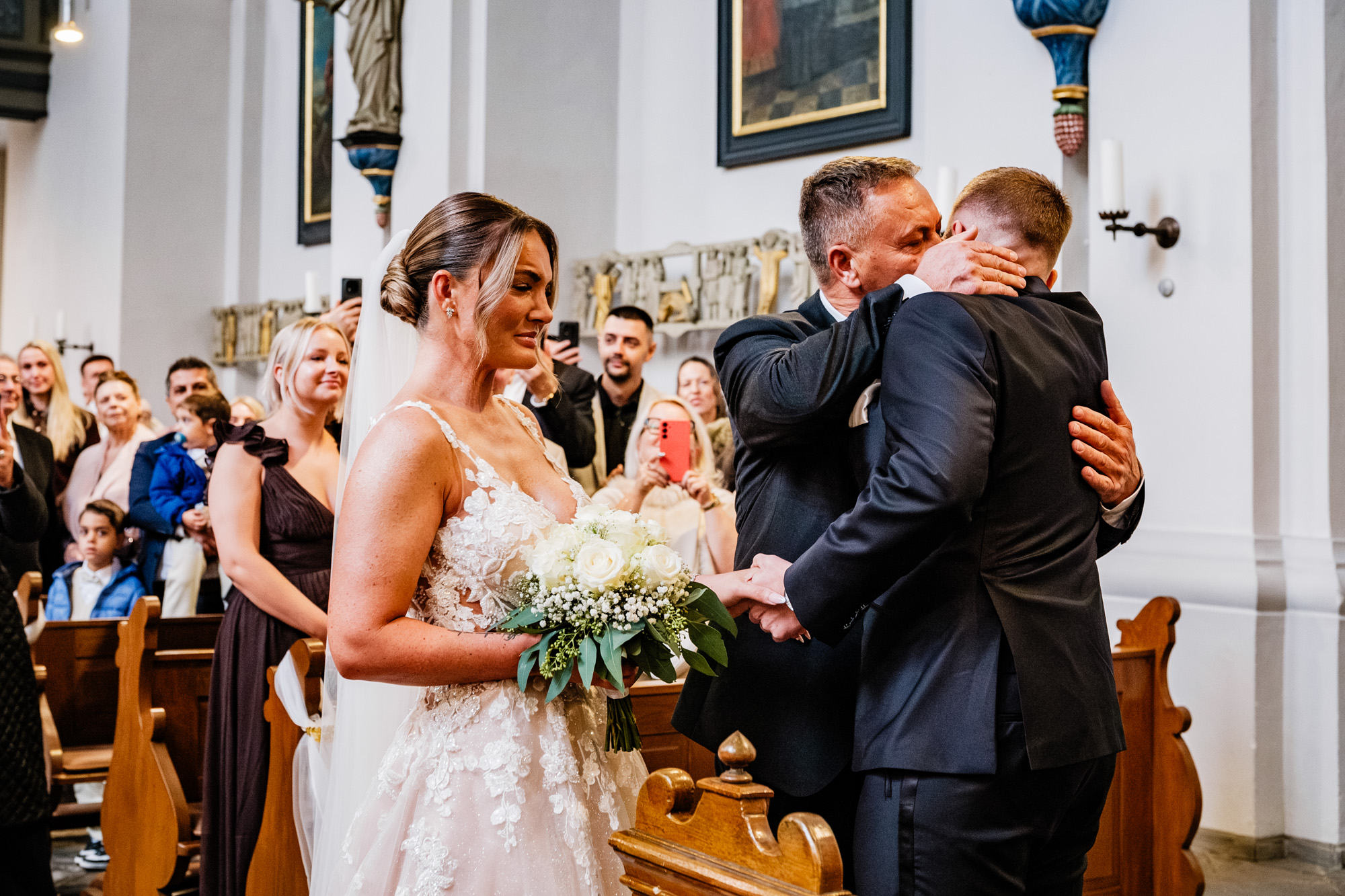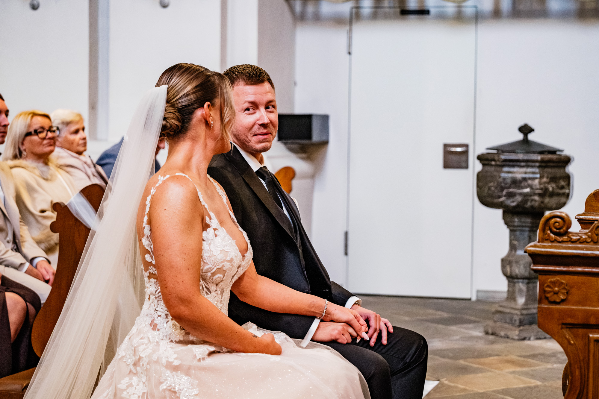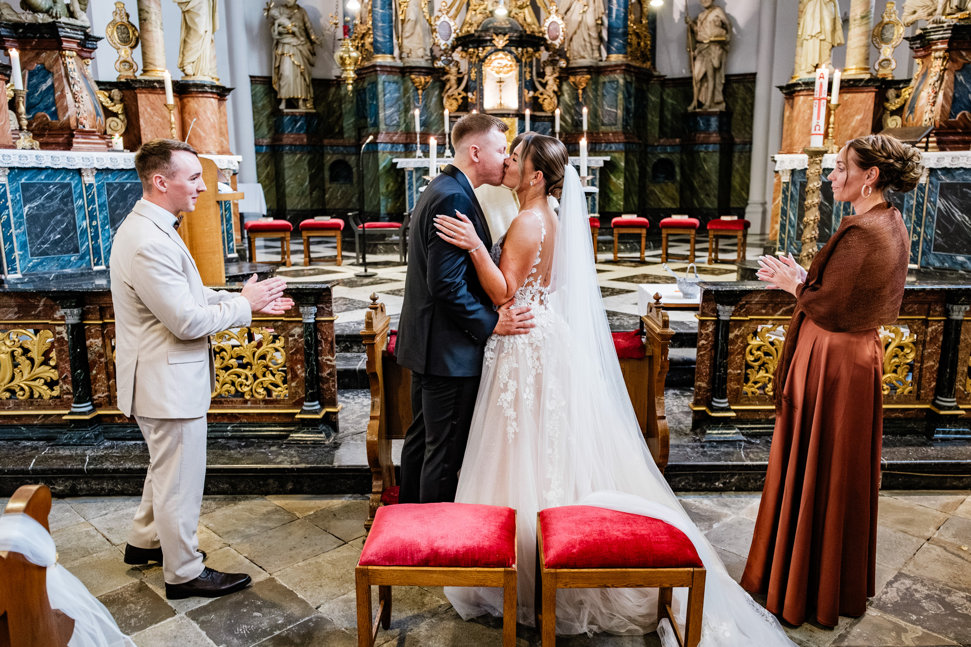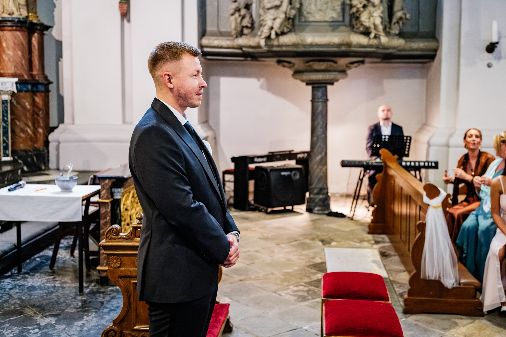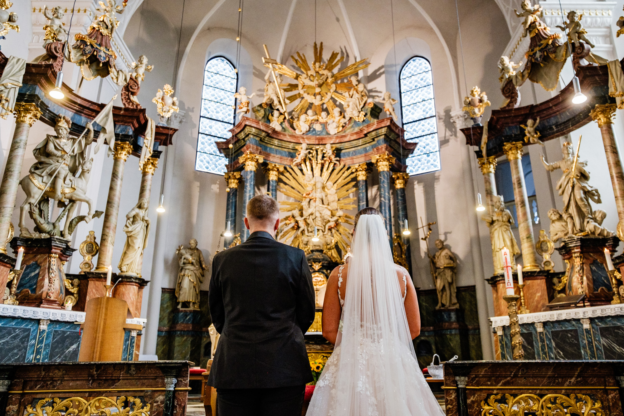 Danach ging es zur kirchlichen Trauung. Ich liebe es, diesen Moment zu fotografieren, wenn sich die Türen der Kirche öffnen und die Braut ihren großen Auftritt hat. Als Silvana mit ihrem Papa den Gang entlangschritt und Mateusz sie zum ersten Mal im Brautkleid sah, war da dieser Blick – voller Liebe, Staunen und Glück. Solche Sekunden sagen oft mehr als tausend Worte.