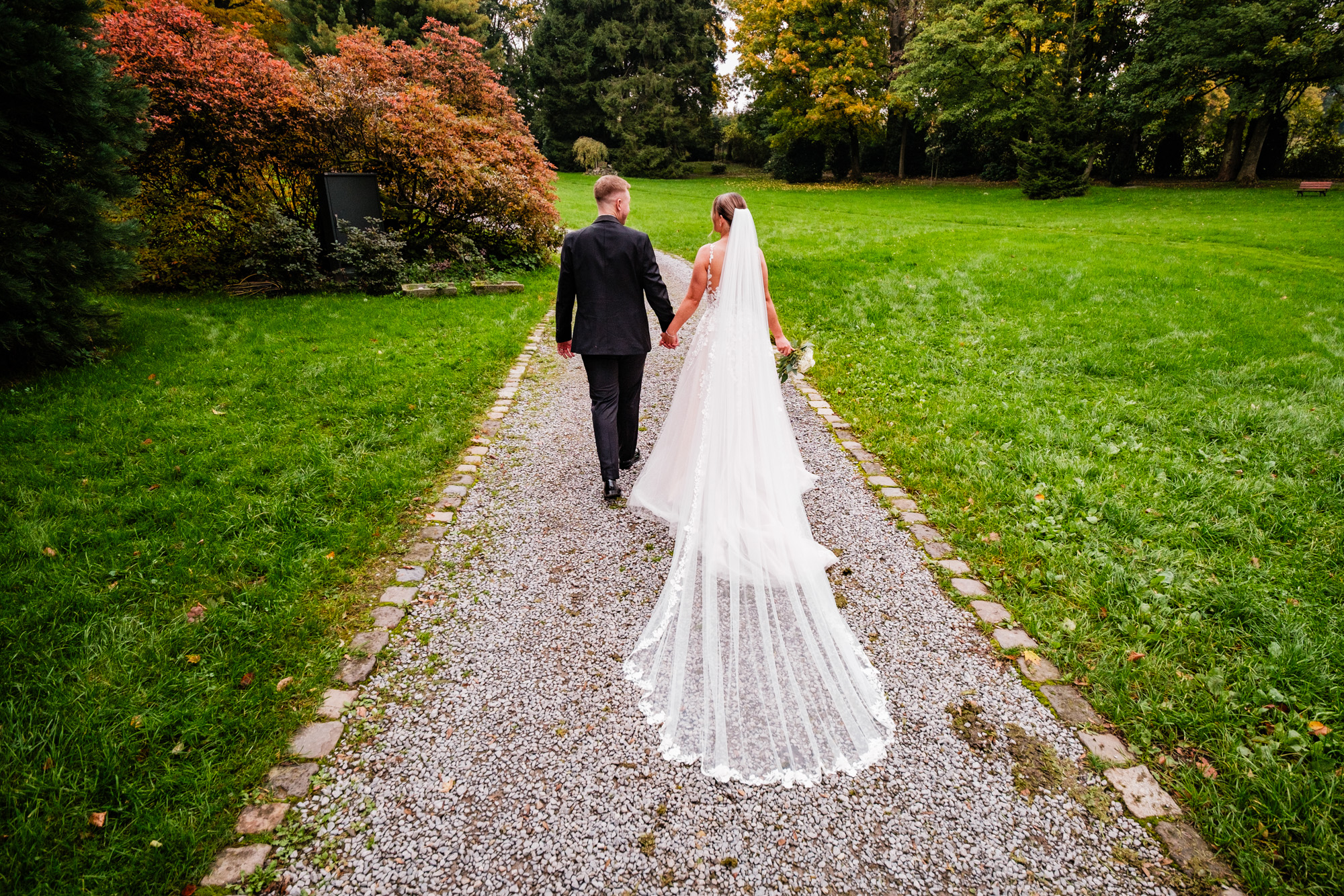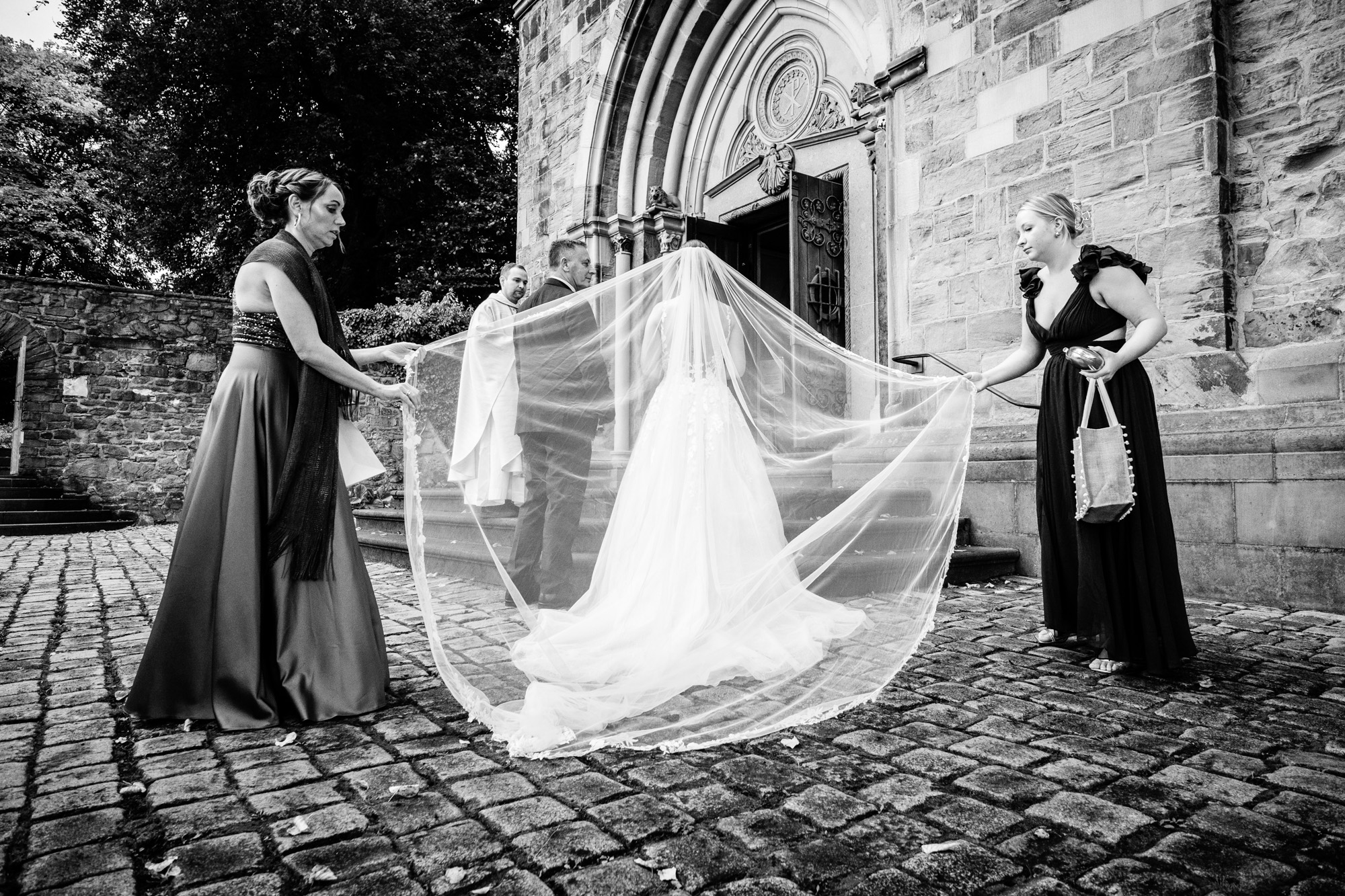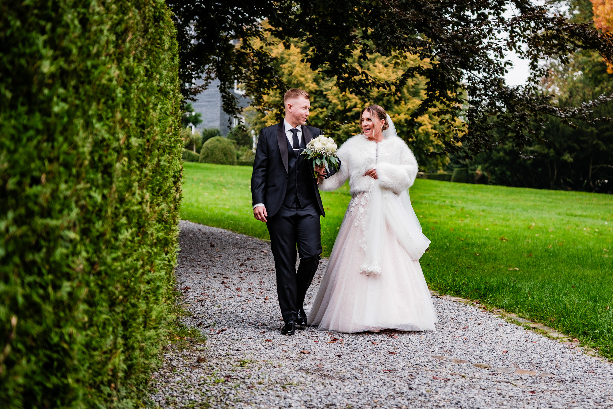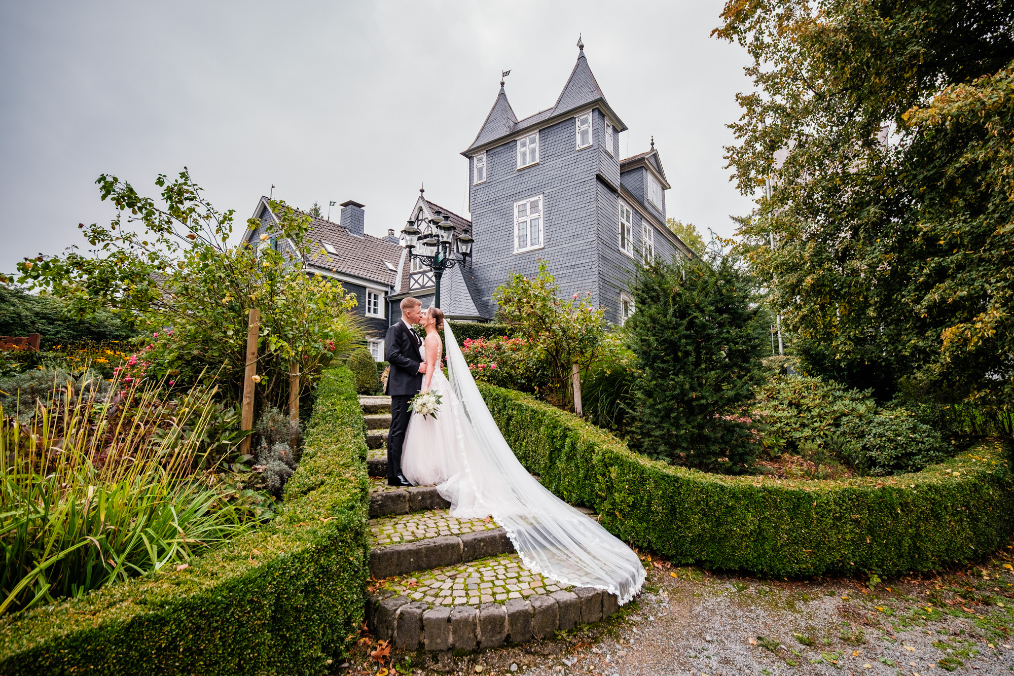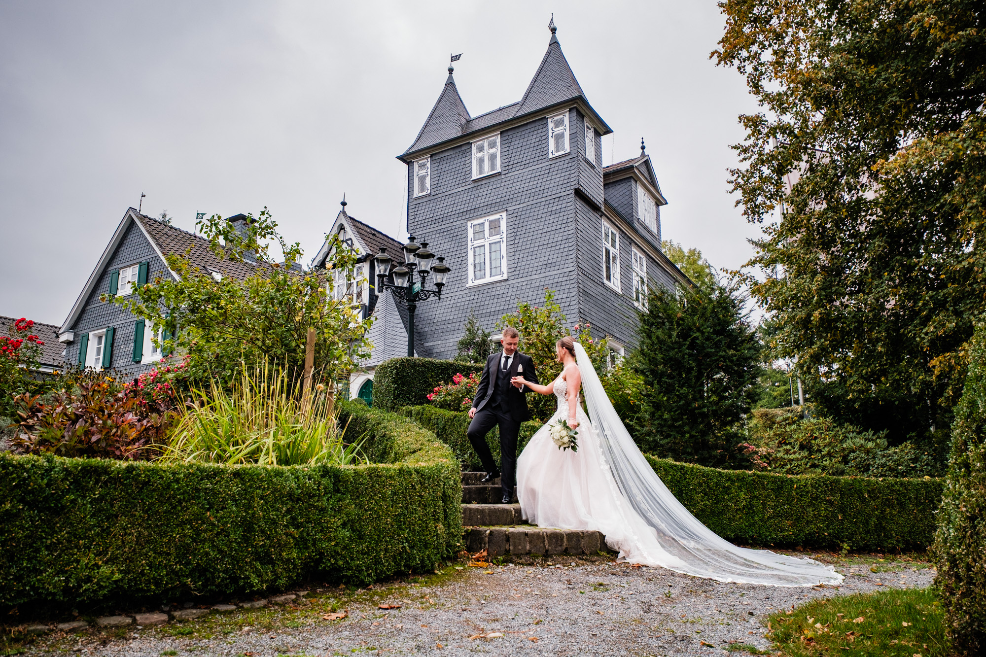 Nach der emotionalen Zeremonie und ein paar Gruppenbildern vor der Kirche fuhren wir weiter zum Sektempfang im Schloss Grünewald in Solingen – einer traumhaften Kulisse, die ich als Hochzeitsfotograf Solingen wieder gern besuche. Das Schloss, umgeben von einem schönen parkähnlichem Gelände mit vielen Bäumen, Pflanzen und Wiesen bot die perfekte Bühne für viele schöne, natürliche Fotos. Es wurde angestoßen, gelacht, gratuliert – pure Freude, wohin man schaute.